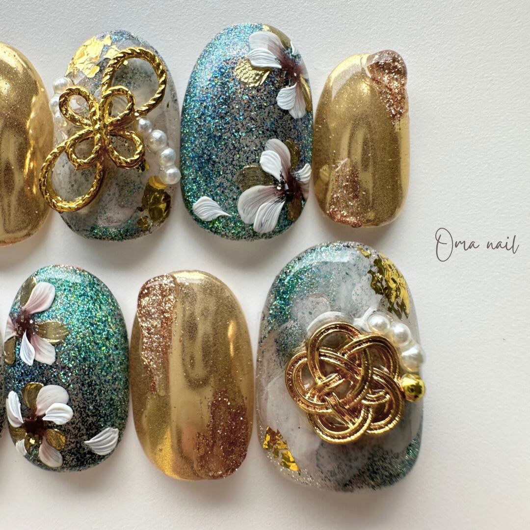 粒子が大きいグリーンマグネットジェルを使用した和装用ネイルデザインです。