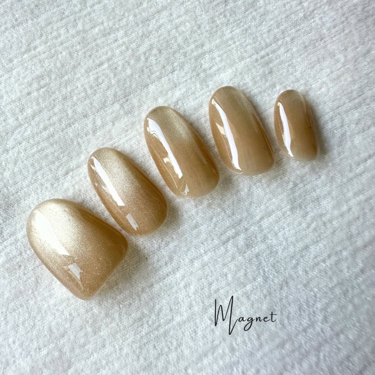オーカーカラーの粒子が細かい水光シルキーマグネットネイルです。