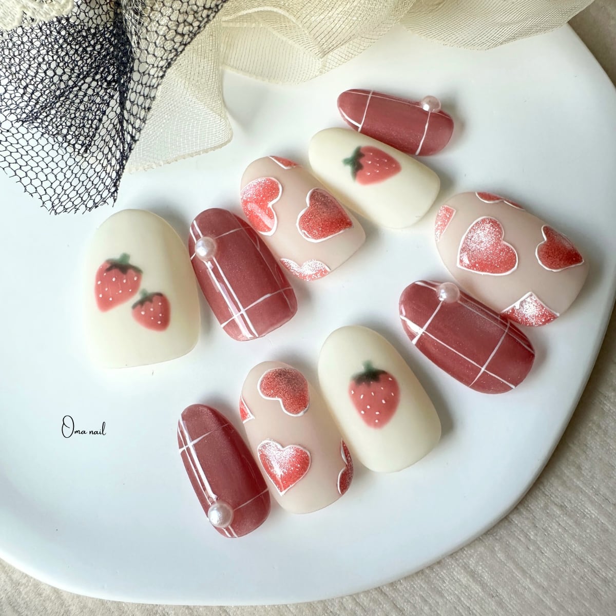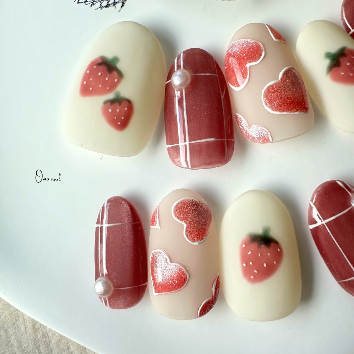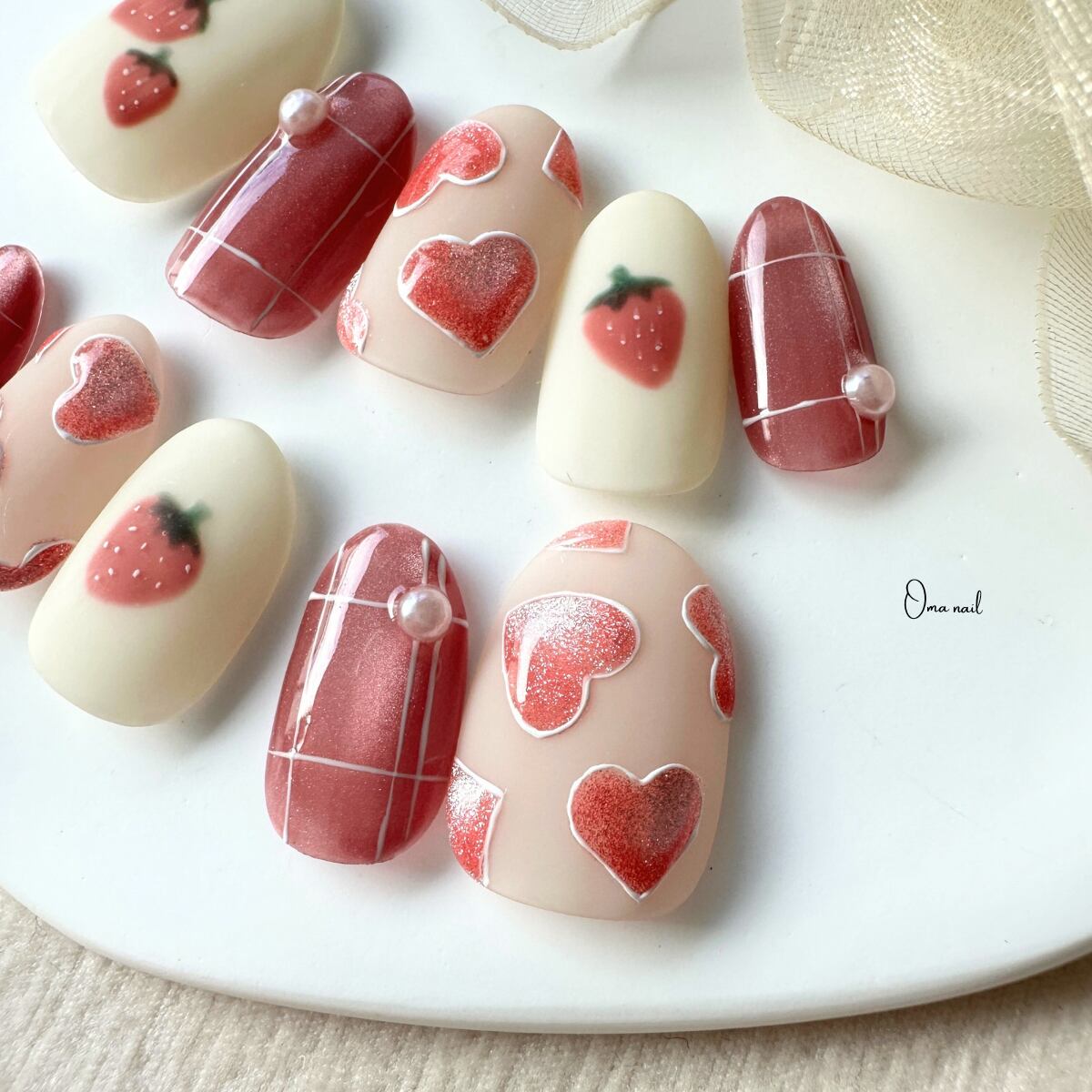 マグネットジェルで作った立体的なハートと手書きいちごがかわいいガーリーデザインです。